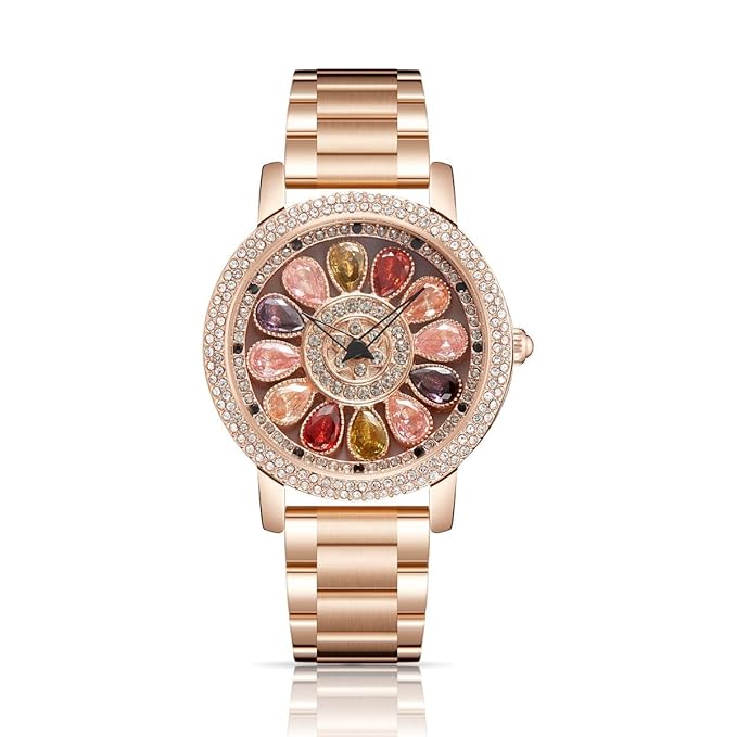 • Rotating Dial Watch: Elevate your style with this unique women’s watch, a gem among watches for women. Its dazzling multi-colored, diamond-studded dial is a true spectacle. The centerpiece, a large, rotating flower, completes the wrist watch for women with a 360-degree spin, adding an unexpected twist of charm to your day. This watch is not just a timepiece, but a statement of elegance and wonder, perfect for the modern woman.
